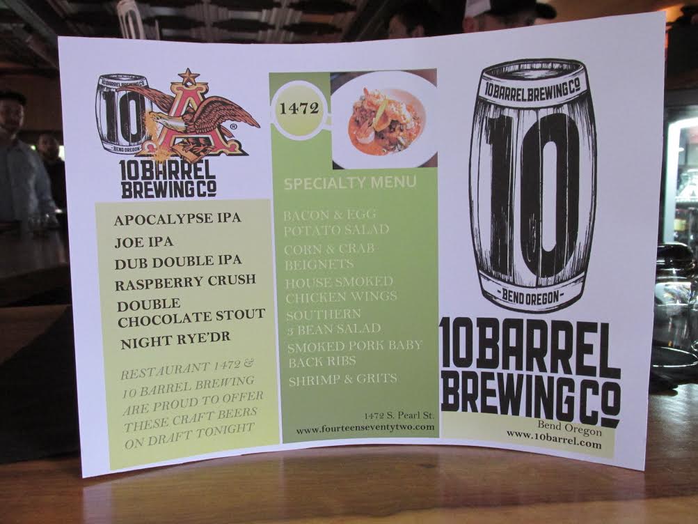 I stopped by Fourteen Seventy-Two the other evening for the 10 Barrel tap takeover and got to try several of their beers. Hop heads rejoice! In addition to Apocalypse, they also had two more IPAs available: JOE and DUB (double). But 10 Barrel does far more than just hoppy beers. They brew a wide range of styles, such as Cucumber Crush Berliner Weisse, Double Chocolate Stout, Night Ryed’r Rye/Porter, and more.